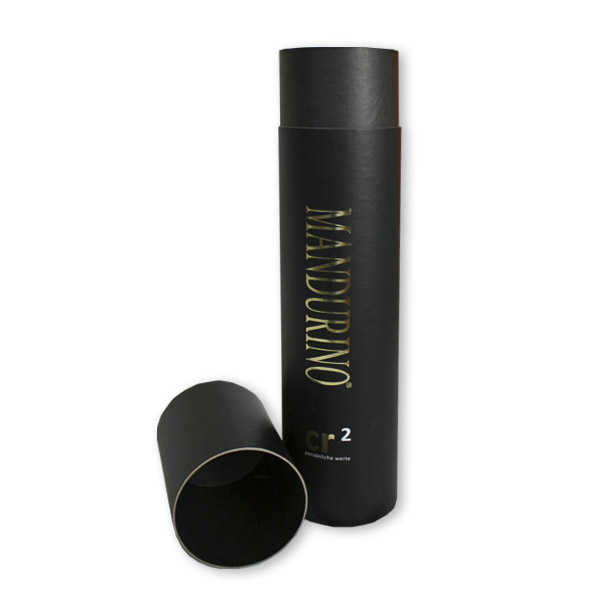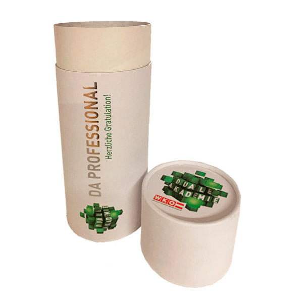 3-teilige Rundverpackung bedruckt + Lack + Silberfolienprägung – Deckeldisk ebenso bedruckt + Lack |