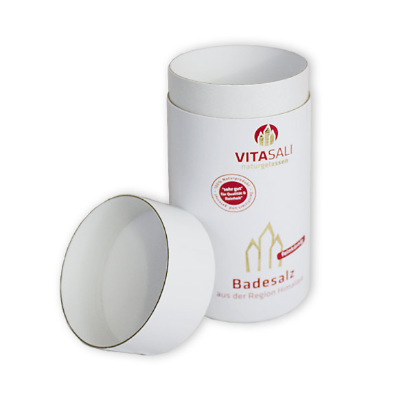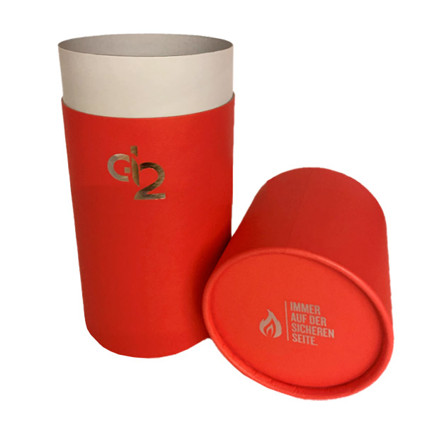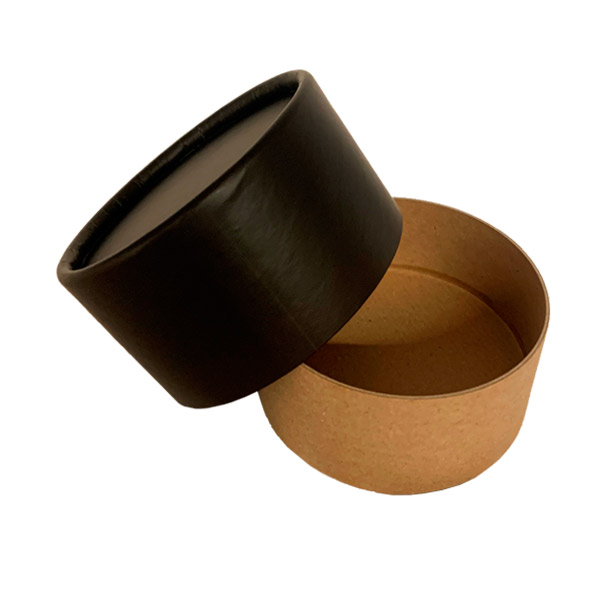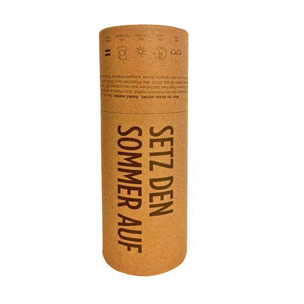 2-teilige Rundverpackung, Unterteil unbedruckt (Recyclingpapier natur - parallel kaschiert), Oberteil bedruckt + Lack / Hier wird der Deckel über den Unterteil geschoben. |