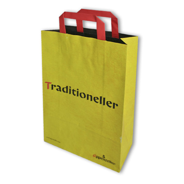 Papiertragetasche mit 5-fach gelegtem Innenhenkel / Weißes Kraftpapier, Druck aussen: 4-färbig Flexodruck, Druck innen: 1-färbig Flexodruck, eingefärbter Papierhenkel (laut Pantone) |