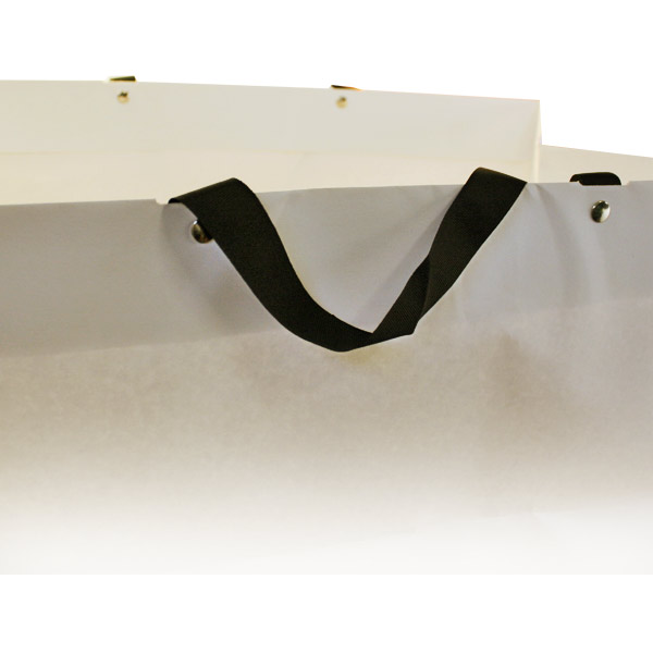 Luxustragetasche mit RIPSBAND aus der Überlappung rauskom- mend / Bzgl. der Tragekraft wurde das Ripsband in die Tasche eingenietet. |