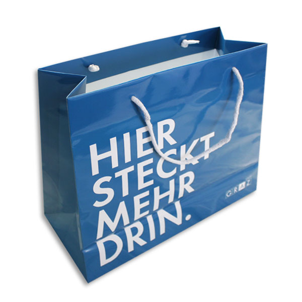 Luxustragetaschen mit langer Baumwollkordel / matt plastifiziert, 2-färbig Offset plus partieller UV-Lack glänzend |