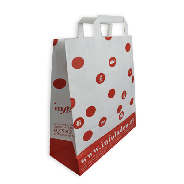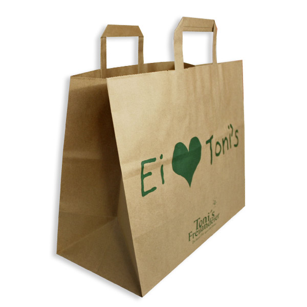Papiertragetaschen mit 5-fach gelegtem Innenhenkel / 1-färbig Flexodruck, weißes geripptes Kraftpapier |