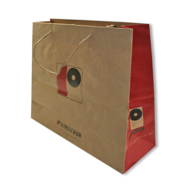 Luxustragetasche mit gedrehter Papierkordel eingeknotet / 2-färbig Offsetdruck, braunes geripptes Kraftpapier |